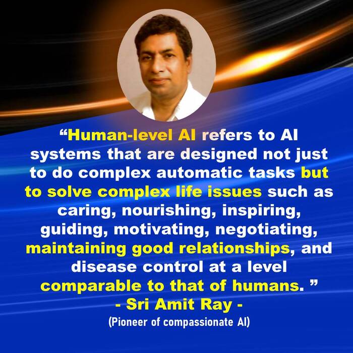 “Human-level AI refers to AI systems that are designed not just to do complex automatic tasks but to solve complex life issues such as caring, nourishing, inspiring, guiding, motivating, negotiating, maintaining good relationships, and disease control at a level comparable to that of humans.”