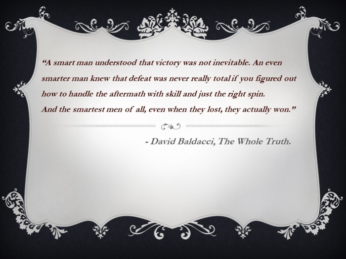 “A smart man understood that victory was not inevitable. An even smarter man knew that defeat was never really total if you figured out how to handle the aftermath with skill and just the right spin.