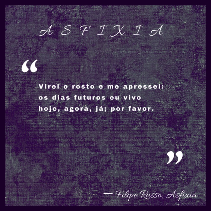 “Como agir sem pressupor? Sem arriscar um experimento à queima-roupa? Pra que viver sem expectativas? Sem a esperança de um prazer desinibido? Aspiro inspirações, inspiro aspirações e vivo elucidações líricas até expirar de vez o sopro de vida para longe, longe do meu peito. Quem sabe até tuas mãos.”