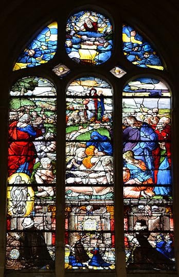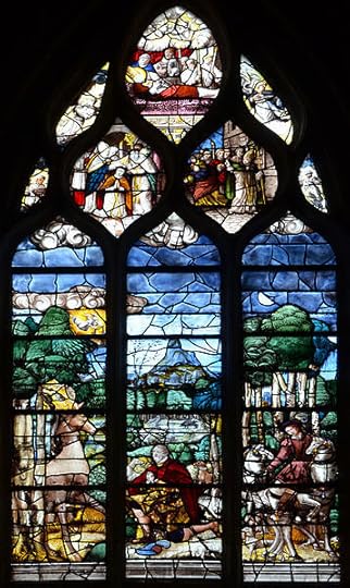 La Duchesse is keen to visit the stained glass of Montfort-l'Amaury.There are 37 of these pieces and I am posting a couple of the windows, the St-Hubert and the one of Lazarus. They are from the Renaissance and although I am generally not too fond of Renaissance stained glass (much prefer the Medieval), these are very beautiful.