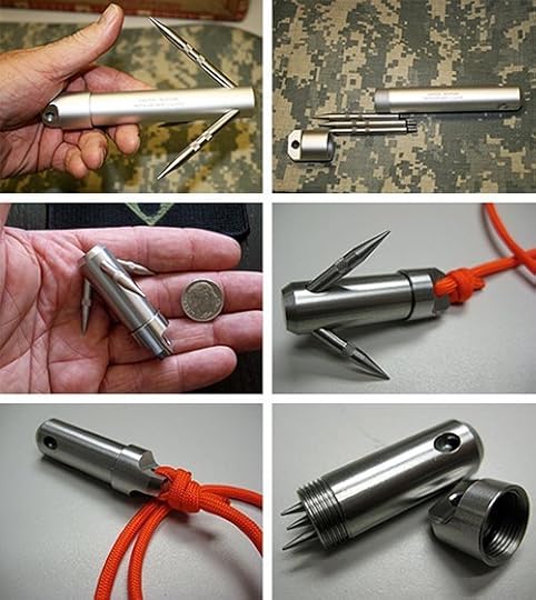 Other: The needles are on his left wrist were the hidden blade is on his right.The kunai are on his thighs and the rope dart is coiled around his bicep concealed by his cloths.He is lettaily a one man army
