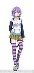 Appearance: Mizore has light purple hair which was long when she was introduced, but she later has it cut and blue colored eyes, which are nearly completely blue and have a bit of purple at the top of them in close images of her. Also the pupils are not black, and are almost as blue as the rest of her eyes. At school, she wears a different kind of uniform than most of her classmates. She wears a light brown pleated checkered skirt like other female students, but she also wears a white sweatshirt with long dark blue sleeves, a black singlet underneath, and a yellow pendant over her neck. She wears long dark and light purple-striped stockings with white shoes and has a belt tied to her left leg. It is unknown what she kept in the front pouch of her sweatshirt, though she have been known to keep her journal about Tsukune and a lollipop which maintains her body temperature there.