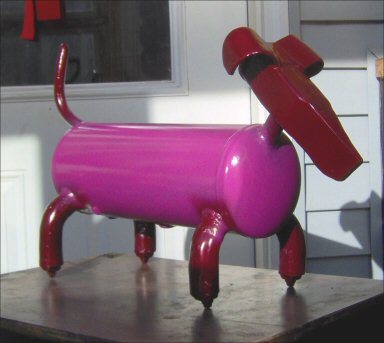I was able to borrow a car today, fortunate because my new embroidered work coat was done! Woo Hoo.. I may not work but it looks like I'm working between the farm logos on the new coat and the hats I got a few months ago!I was also able to stop in at the Auto Store to see what coating systems thay have. If I don't paint the weenie dog the thin metal body would soon succumb to rust. Scupltures made from older heavier metal tend to be more elegant and lend themselves to getting rusty and lasting a long time. Not so with the whimsical weenie dog!