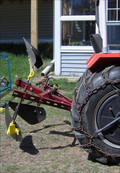 Moment of truth.. will my implement designs created in the Winter work now that it's Spring? The object is to be "wiser" in my old age, and accomplish labor intensive garden tasks with the tractor. First I'll furrow an eight inch deep trench to add fertilizer, second I'll start to build up the bed, third I'll do a four inch trench for the irrigation line, and finally I'll bury the line while building up the bed even more. Such are the best laid plans....