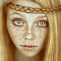 Tall, dark brown hair, pale skin, green eyes, freckles.