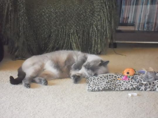 (Kublai) Khan, rolling around and rubbing his face on a catnip pillow