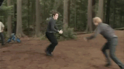 When Eliza stopped to look up at the canopy of leaves that was above their heads when they stepped into the forest Jacob stopped for a moment and turned his head to watch her, chuckling lightly when she asked him about the permanent smell of rain that lingered in the forest rain. "Are you even from Forks?" He asked her before nodding, "Yes, it smells like rain here all the time." Jake lowered his arm from her shoulders when the two of them began crossing a river and Eliza stepped up onto a log, her arms outstretched to keep her balance as she walked at the same pace as him on the way across. But she slipped, tumbling towards the water below. In a quick reaction, Jacob lunged forward, his arms wrapping around her waist and catching her just barely before she could it the water, all that touched the river was her fingers. "Do I need to carry you across, Kitten?" He asked her playfully, standing her upright, removing his arms from her waist as he cleared his throat awkwardly.