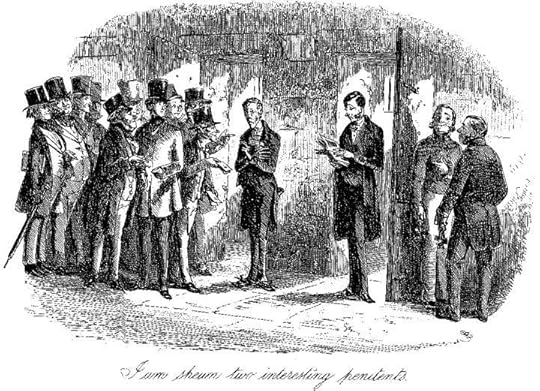 Thus, Phiz has collapsed two textual moments into one scene, and had Uriah pocket the hymnal to distinguish him from Littimer (right), reading a rather thin Bible (perhaps just that tome of suffering and forgiveness, the New Testament). Neither "penitent" is dressed in prison uniform, but, perhaps merely for the sake of visual continuity, wear the swallowtail coats and dark waistcoats associated with middle-class respectability. Last seen in "Steerforth and Mr. Mell", the sadistic schoolmaster Mr. Creakle has unexpectedly reappeared, just as in other Dickens novels, characters from earlier in the narrative have a habit of turning up later in the story, often to effect a plot resolution; he is the somewhat rotund, benign-looking member of the establishment standing immediately beside David Copperfield. The only other youthful face in the congregation, seen immediately over Copperfield's shoulder, must be that of Traddles. On the extreme right of the plate stand the two uniformed turnkeys (not actually mentioned in the text), whose knowing looks exchanged with each other suggest a more normative response to this theatre of contrition, with the lead actors making a palpable hit, if one may judge by the appreciative smiles and gestures of the prison commissioners, not delineated in any detail by Dickens and therefore more or less cut from the same cloth in this illustration of disinterested establishmentarian public benevolence. Our delight in the scene is that the persuasive rogues have so easily deceived the prison governors.