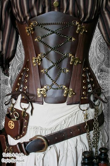 What she wears is really similar to this, but the shirt is a blood red color and the corset is like this.