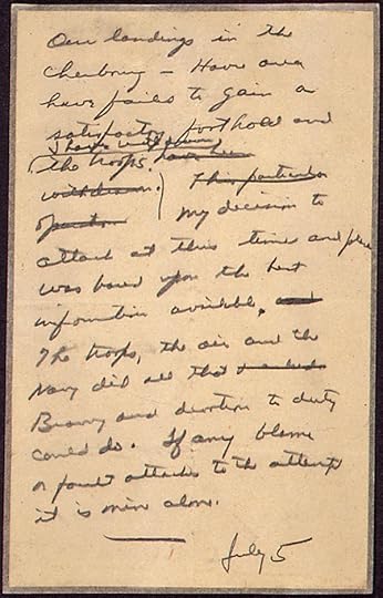 I wonder how many readers are aware that Ike had two speeches prepared for the American people on D-Day. I find the second one which was to be used in case the invasion failed, rather moving. (pg. 373) "Our landings on the Cherbourg-Havre have failed to gain a satisfactory foothold and I have withdrawn the troops....If any blame or fault attaches to the attempt it is mine alone". The failure message was written in his own hand. No passing the buck in case of failure.