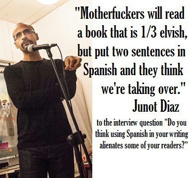 I think part of the reason why Diaz writes like this is because for him, it just fits to put the Spanish in, it's who his characters are, how they think, so he uses it, not caring what other people think. A bilingual person doesn't think in one language but in both and mixes the language a lot. But then again Tolkien did that for elvish, so would his bilingual language be elvish?