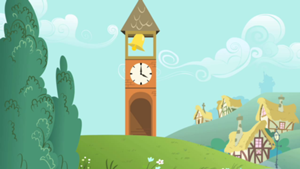 Ponyville's clock tower is visible from the front of Fluttershy's cottage. The number of marks on its face changes between episodes, having eight marks in A Bird in the Hoof and Putting Your Hoof Down, but twelve marks in Hearts and Hooves Day. In Putting Your Hoof Down, the Ponyville tower is mentioned by a stallion tourist.