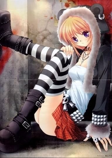 Ichigo: black tank top with skull and crossbones. red miniskirt. Black fishnets and combat boots. Short and spiky black hair with a red highlight.