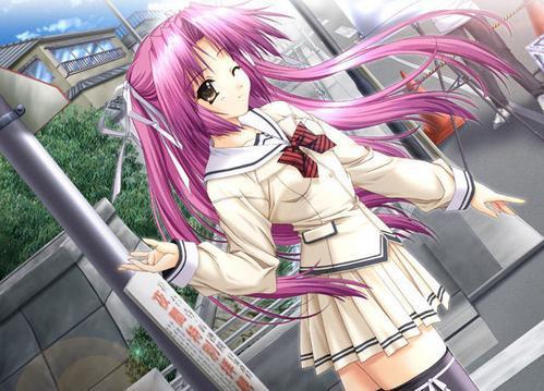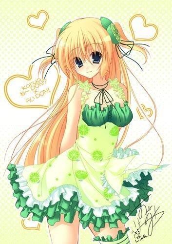 Momo: lightgreen frilly dress, knee high pink socks and flats. Shoulder length blonde hair with a pink ribbon.