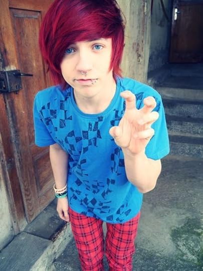 Nate is very small for his his age, both in height and weight. He has a very feminine appearance and he switches between blue, red, and black hair. Right now he has bright red hair and his eyes are naturally bright light blue. He dresses in loose tank tops ( like the one in the last photo ) skinny jeans, hoodies and beanies.