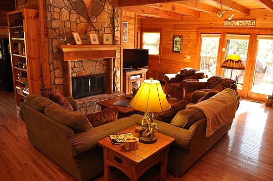 Its is a large room where has the front door. It has a fireplace and 56" screen tv on the wall. It is fairly warm and has creeky floor boards. It is the first room you enter and has the staircase in the room.