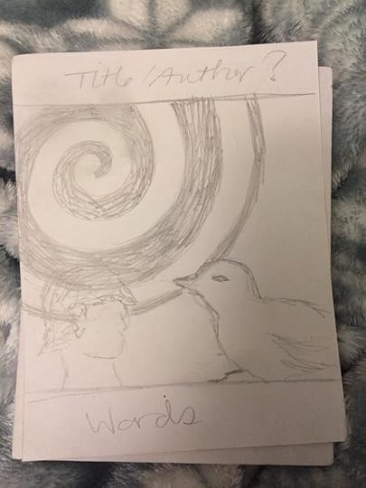 I drew a super rough sketch of what I can remember the cover looking like… I am very certain about the spiral, pretty certain about the bird of some sort, and unsure about the boy/person being on there. The top and bottom I believe were a solid color and the font was just a simple bold font. again i'm pretty sure the title was only 1 or 2 words.