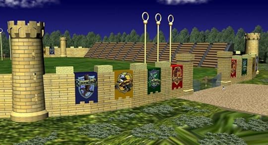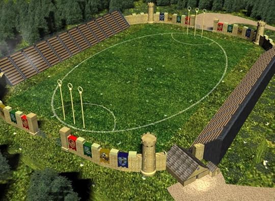 With little more to go on concerning the Quidditch field, I have resorted to looking at the movies, and in particular the "Chamber of Secrets" conceptual artwork (some of which is very good) that was included on the DVD. That explains the little stream, which I thought I would include, especially as there is mention of "running water" heard in the Forest just before they meet the centaurs in Book One (Stone251).