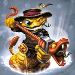 Some say Rattle Shake was the best tracker in the Cloudbreak Islands. Others say he could strike the center of a gold coin at a thousand paces. But the legend of Rattle Shake was immortalized when he found himself trapped by the Black Hat Gang, the infamous group of cowboys who literally were large cows… and evil ones at that. They threatened to plunder the local village unless Rattle Shake led them inside the magical volcano Mount Cloudbreak, where they hoped to discover enchanted treasure. Badly outnumbered, the ever calm Rattle Shake magically summoned every snake in the area and overtook the notorious bovines in an epic fight. The tale of his heroism was heard by Master Eon, who then recruited him to the Skylanders.