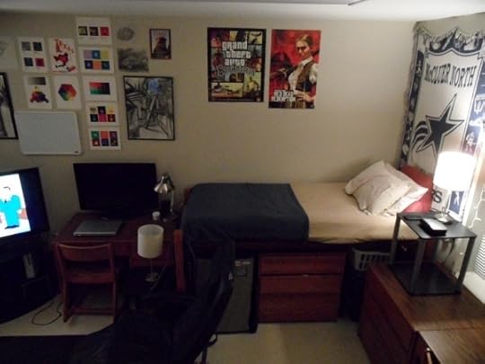Jack walks in to his dorm. After all this trouble he was finally here. He sits down in his bed and thinks about if he will ever call this place home. He gets up when he realises how hungry he is and trips on a stack of books and falls.