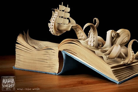 My favorite altered book picture was part of a promotion for Anagram Bookshop, in Prague, which is an English-language bookshop with a vast assortment of fiction and nonfiction. Anagram came out with many ads like the one below, beautifully illustrating their slogan “Words Create Worlds.”