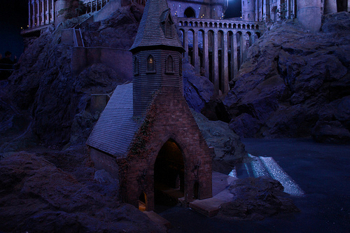 "The little boats carried them through a curtain of ivy which hid a wide opening in the cliff face. They were carried along a dark tunnel, which seemed to be taking them right underneath the castle, until they reached a kind of under-ground harbour, where they clambered out onto the rocks." —The First year students' boat journey to Hogwarts.