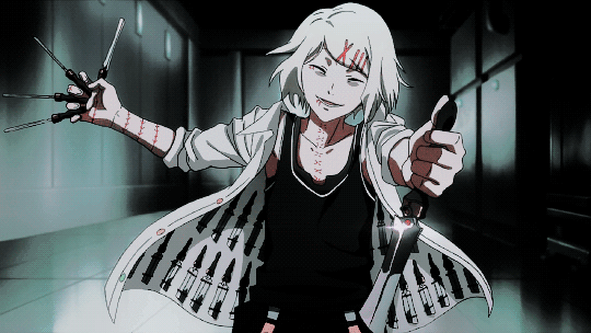 ➛ Cyra can be seen wearing light simple clothes that are comfortable and conceal knives and daggers out. Like big white shirts with lots of inner pockets, tank tops and black leggings/pants. Sometimes leg warmers and slip on shoes. Though on the hunt or professional job to terminate a person his outfit drastically changes from a casual to a black leather military like suit with a tool belt like a superheroes handy dandy belt around his waist. And knife belts over his shoulders strung with an arrangement of his favourite knives. Set with gloved and combat boot that make it hard to trace him. Often seen in this outfit with pulled up hair.