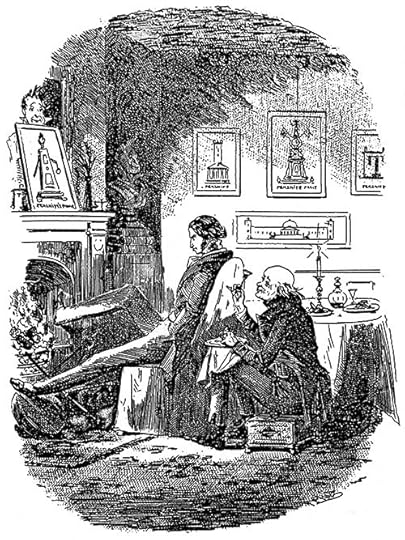 Chapter 6 has us witness poor Tom Pinch and the new pupil in close conversation, and as Martin discloses quite a lot about himself in this chapter, we might ask ourselves the question how we like this new hero of Dickens's? [Pray notice my idiosyncratic use of the question mark here!] To a certain extent, he reminds me of young Nickleby.