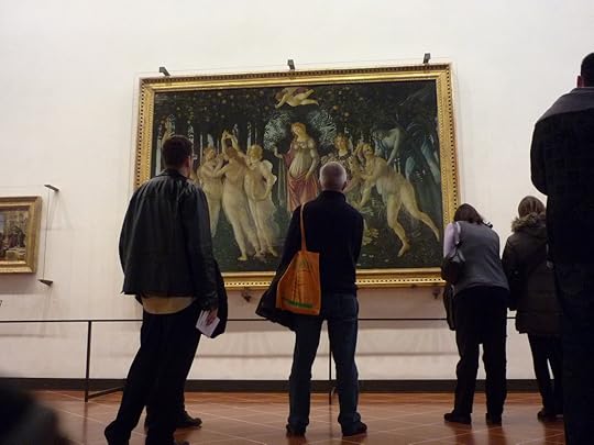I really enjoy Cumming's style in this book. She writes eloquently and with a great sense of passion and mystery about art and people. One thing that struck me from the very get go in chapter 1 was the concept of the size of paintings. Most of the time we are exposed to paintings (and art in general) through text books or media on the internet/magazines, and rarely appreciate the actual size of a work. This really hit the mark in my own life years ago when I walked into a room in the Uffizi gallery in Florence and encountered Botticelli's "La Primavera". It covered an enormous wall from floor to ceiling. I was awestruck never having realized the enormity (6′ 8″ x 10′ 4″) of the painting.