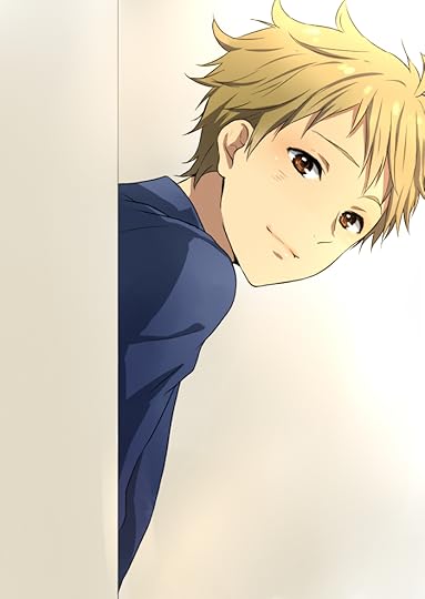 Fie has lilac colored hair cut short at the back with two strands extending to his stomach and fading to a slightly darker lavender color as it reaches the tips.