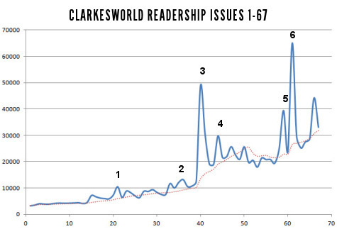 Sadly, that isn't necessarily the case. Stories get mentioned outside their circles all the time, but very few of them result in meaningful spikes. Even fewer of those manage to grow legs (triggering more mentions outside normal circles), which is when I consider a potentially viral situation to have begun.I've used this graph to demonstrate viral spikes at Clarkesworld:
