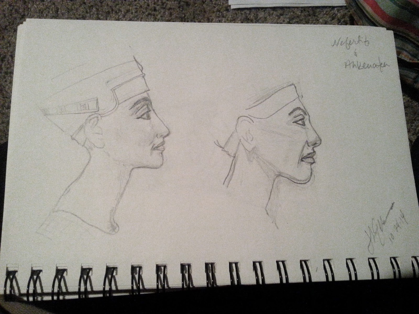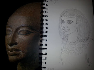 Here are some sketches I've done of my main characters. This first one is a comparative of a photo of a bust believed to be Meryaten beside my sketch. I found it important to see her not as a faded image from the past but as a flesh and blood person who once helped rule a nation: