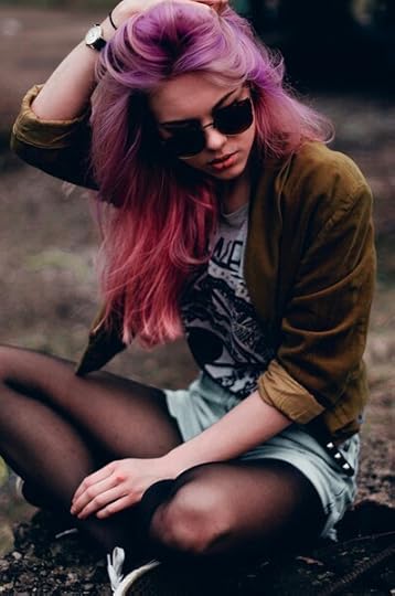 She has pink and purple hair that touches down her mid back that is curly. She is fairly skinny with shapely breasts and bottom. Her eyes are a silver blue and her skin is very pale