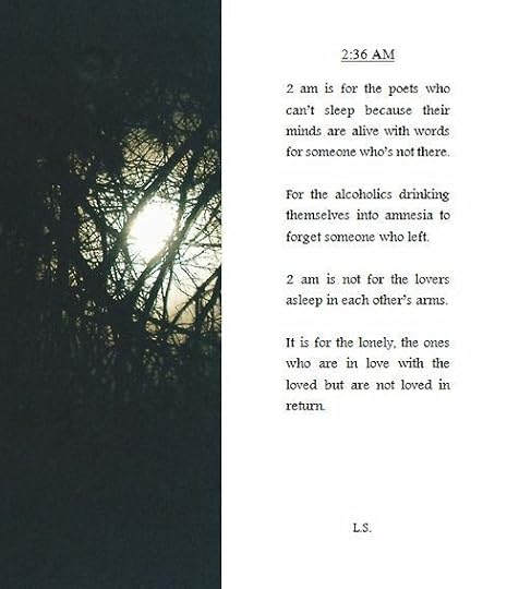 2 AMIt's 2:36 AM and I'm still lying awake, because 2 AM is not for the lovers who sleep in each other's loving arms, dreaming of sunny days and smiling as the stars shine outside the window. 2 AM is for the poets and writers who can't sleep because their minds are alive and running wild with the words for someone who's not there to accept them. 2 AM is for the alcoholics drinking themselves into amnesia and the smokers who sit and watch their sorrows drift up in smoke, trying so hard to forget someone who left without a second thought. 2 AM is for the brokenhearted with tear-stained faces and glassy eyes, the ones who lose track of what is in front of them as they desperately cling on to the past, trying to re-live the memories.