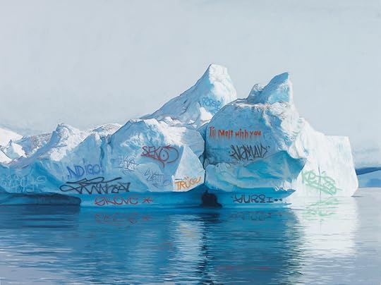 "For Keyes, the decision to place graffiti writing in the foreground questions our relationship to the natural world, and what impact we are undeniably leaving on our planet. The iceberg for instance, is marked with the words, “I’ll melt with you.” This blood red message could be the voice of both the iceberg and the tagger, a warning that we will all be melting if we continue to desecrate the Earth.
