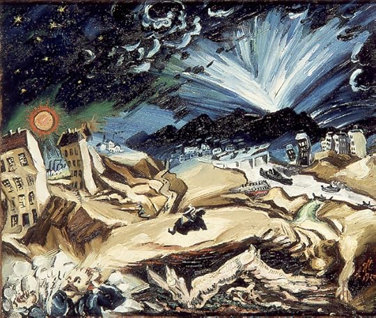 These WWI paintings are striking, aren't they? I also find Vallotton's abstract depiction of the hellish warfield landscape easier to look at than Grosz' more violent one, with its torn bodies and the fire bombs exploding in the middle of the far-from-the-frontline city. No doubt that Grosz' subtext and depiction is much more unsettling than Vallotton's aesthetic and safer approach.