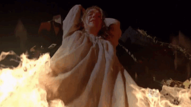The punished witch is dressed in white while the other members dress in black. Gasoline is poured over the witch and a fire is set until at last all essence of life have vanished. A witch has avoided this fate, because of a talented witch who had the ability to bring back the dead and heal them. It all became a surprise to the coven when it had happened, but none-the-less the witch was burned again accepting her fate fully. During which time the witch was granted to wear the colour red showing that her coven respected such dying wishes.