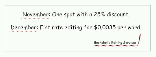 Looking for an editor with reasonable fees and good quality at the same time? A person you can email at any time and ask whatever questions you have about books in general, not just editing? Someone who actually cares about your book? A person who will keep you updated during the whole editing process, so you know what's actually being done to your book?