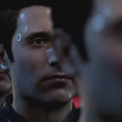 aubree: androids have serial numbers tattooed on the side of their neck, kind of like a bar code, they also have a ring on the side of their head that lights up, especially when they experience a change in emotion. it looks something like this: