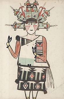 Palahiko Mana, Water-Drinking Maiden, Hopi 1899. She wears a headdress with stepped Earth signs and corn ears. Water Drinking Woman seems to be a name for the corn itself, one of many forms of the Corn Maidens.