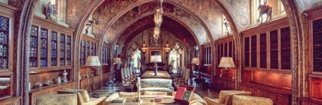 The library is on the third floor, with a winding staircase down to the second floor. Old books and manuscripts are locked up behind glass boxes. Chairs and sofas are within its confines. There are small rooms near the back for tutoring, and classrooms also are evident there.