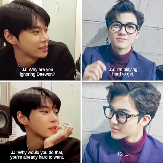 hyunjin and joohyuk are suffering at the hands of their groups meanwhile jinseok is just chilling and braiding the team g girls' hair