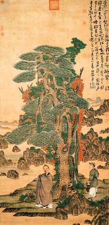 A Tall Pine and Daoist Immortal, ink and colour on silk hanging scroll with self-portrait (bottom centre) by Chen Hongshou, 1635, Ming dynasty; in the National Palace Museum, Taipei, Taiwan.