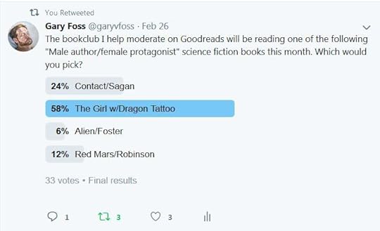Interesting. Twitter (or, at least, that tiny fraction of Twitter that sees/responds my tweets) thought we should read The Girl with the Dragon Tattoo. That is the most contemporaneous of those books, and the others all got votes in their publication order, oldest least. It's not like that's nearly large enough a random sample to draw any conclusions, but it's the first thing that leaps out to me when I see the Twitter results: