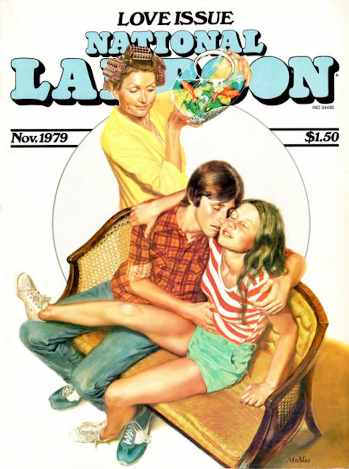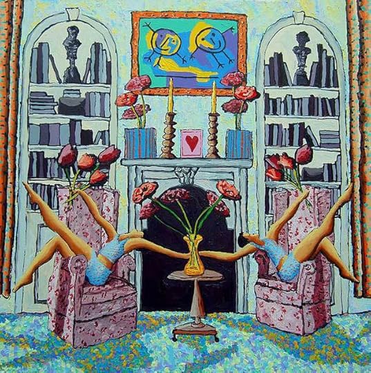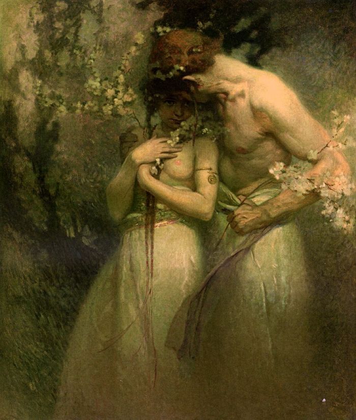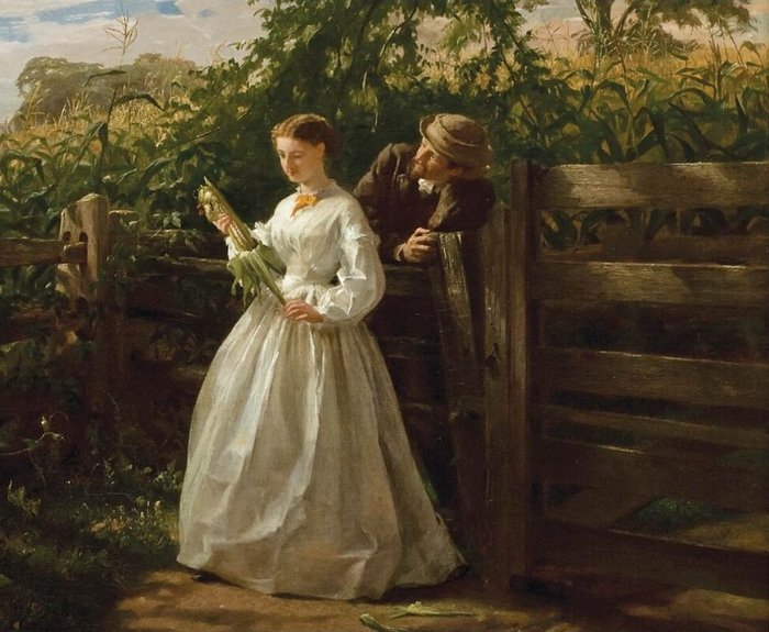 style (billowing, slippery dresses and bedsheets, just-plucked flowers) and a fair amount of sly symbolism, the painter makes clear what will happen next. The bolt and the vase stand in for the phallus and vagina, respectively, while the overturned chair, with its legs in the air, alludes not-so-subtly to the subjects’ urge for a more acrobatic roll in the hay.