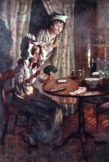 Yes; playing cribbage with herself at the table. There she sat, intent upon her game, coughing now and then in a subdued manner as if she feared to disturb him—shuffling the cards, cutting, dealing, playing, counting, pegging—going through all the mysteries of cribbage as if she had been in full practice from her cradle! Mr Swiveller contemplated these things for a short time, and suffering the curtain to fall into its former position, laid his head on the pillow again.