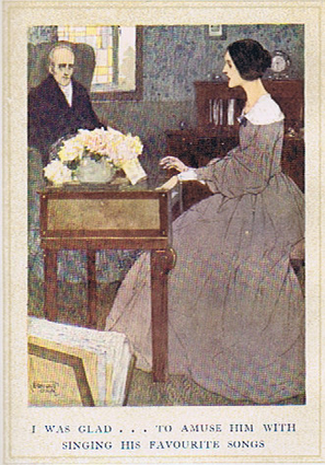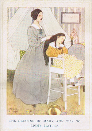 Edmund Dulac's illustration of Agnes Grey brushing Mary Ann's hair: "The dressing of Mary Ann was no light matter"
