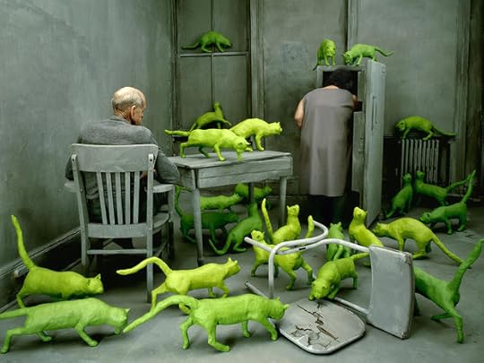 Sandy Skoglund is an American photographer and installation artist known for her Surrealist, brightly colored images. Often featuring elaborate tableaux of animals and posed human actors, one of her most famous work is 1980s Radioactive Cats, which depicts neon-green cats—painstakingly crafted out of chicken wire and plaster—stalking an otherwise drab gray kitchen. She was born on September 11, 1946 in Quincy, MA and graduated from Smith College in 1968 with a degree in art history and studio art. She went on to study at the Sorbonne and École du Louvre in Paris, as well as the University of Iowa. From 1973 to 1976, she worked as a professor of art at the University of Hartford, and then began teaching at Rutgers University in New Jersey. Her works are held in several museum collections, including the Museum of Contemporary Photography in Chicago, the San Francisco Museum of Modern Art, and the Dayton Art Institute in Ohio.