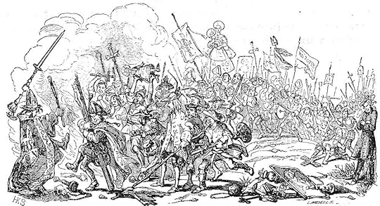 In the same manner, they marched to the place of rendezvous agreed upon, made great fires in the fields, and reserving the most valuable of their spoils, burnt the rest. Priestly garments, images of saints, rich stuffs and ornaments, altar-furniture and household goods, were cast into the flames, and shed a glare on the whole country round; but they danced and howled, and roared about these fires till they were tired, and were never for an instant checked.