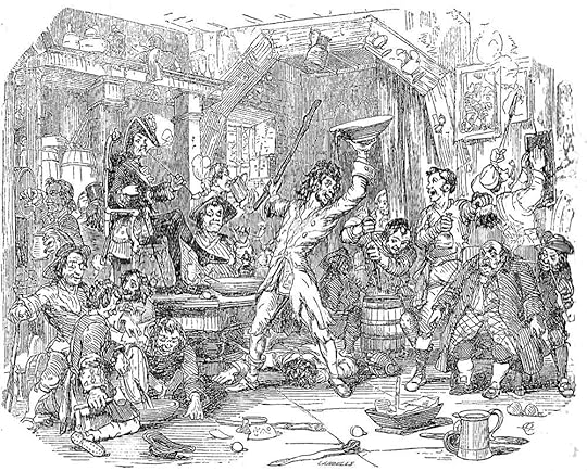 John Willet stunned in his chair is so very tragic. He's been one of my favorite characters and I just hate to see him come to this. I'm far more struck and saddened by this scene than by the shrieking mother from the last set of chapters. Dickens has done so much more to lay the ground for the destruction of John, who is a very, very flawed person but nonetheless a person, and who deserves better than to see his life's work treated like this.It's also interesting to see how Dickens uses John's distress as a way to elicit the different characters of Hugh and Dennis. This is very good kill-two-birds-with-one-stone writing, or three birds: we get a further development of John's character, a deepening of our understanding of the riot and its destructive forces, and a clearer sense of how far different rioters might take things and what that says about them.